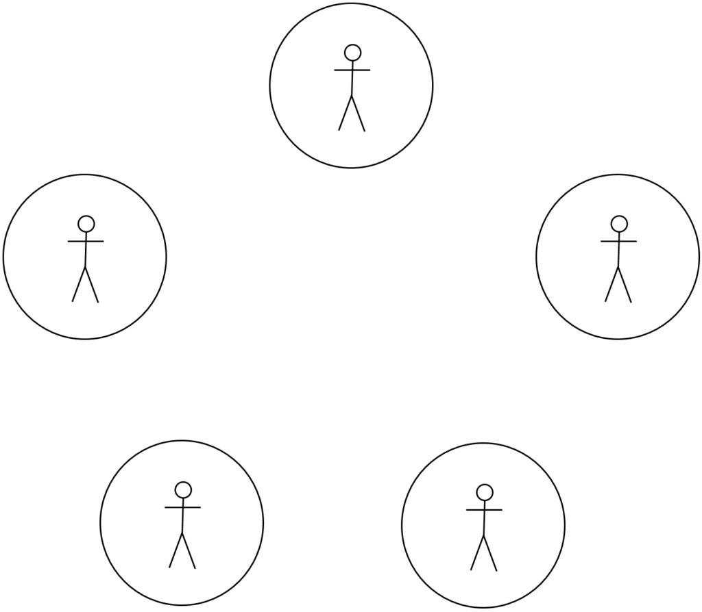 Ça, c’est le schéma d’une famille « idéale » dans un monde parfait. Comme vous le pressentez, à l’heure actuelle, dans la quasi-totalité des cercles familiaux, les âmes ne sont pas incarnées comme ça. Le schéma énergétique d’une famille standard actuelle, tel que je le perçois, cela ressemblerait plutôt à cela :